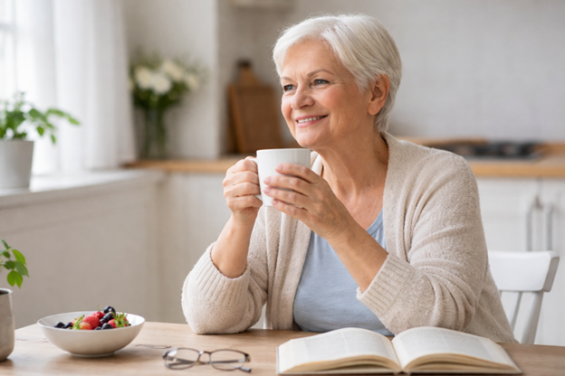 Senior relaxing in a calm independent living community environment to reduce stress